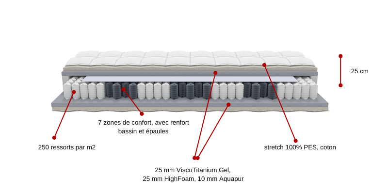 - Une répartition en 7 zones de confort. Les matelas de qualité disposent de zones permettant l'adaptation morphologique de la literie en fonction du poids exercé par chaque utilisateur. En renforçant les points d'appui (épaules et hanches), l'équilibre de votre corps est mieux respecté.
