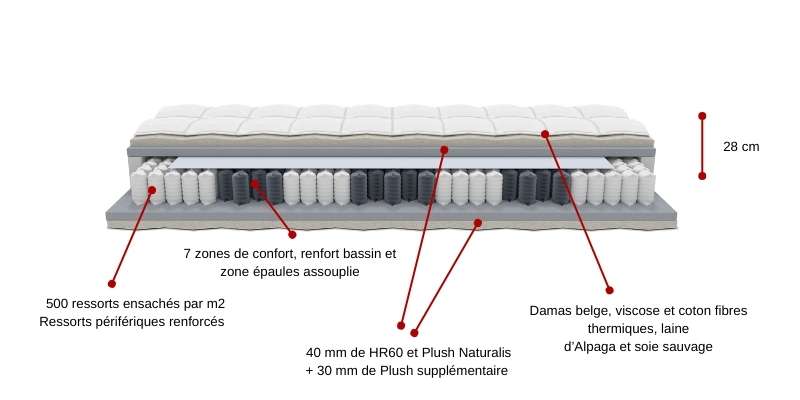 Ce matelas est recouvert d'une couche de 4cm de HR 60kg/m3 et de Plush Naturalis + 3 cm de Plush supplémentaire profilé en 7 zones de confort. L'ensemble est stabilisé par un cadre en HR et profil de ventilation. Il est terminé par une housse en laine d'Alpaga, soie naturelle et fibres thermiques.